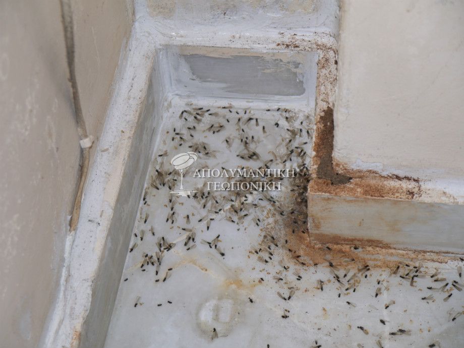 Εμφάνιση πτερωτών αναπαραγωγικών ατόμων τερμίτη (σμηνουργών) κατά τη σμηνουργία σε ισόγεια μονοκατοικία στη Γλυφάδα Αττικής. Οι τερμίτες έχουν εισχωρήσει στην οικία διαμέσου ενός χωμάτινου αγωγού που έχουν διανοίξει εκμεταλλευόμενοι κάποιες πιθανές ρωγμές του τοίχου. Έτσι διατηρούν την επικοινωνία από τον κήπο και με τους σμηνουργούς επεκτείνονται γρήγορα σε όλους τους χώρους της οικίας (με έμφαση τα δωμάτια με ξύλινο πάτωμα και τα εσωτερικά ξύλινα κασώματα). Η ειδική απεντόμωση για την εξάλειψη της αποικίας πραγματοποιήθηκε με τη μέθοδο της Τροφάλλαξης (Trap-Treat-Release).