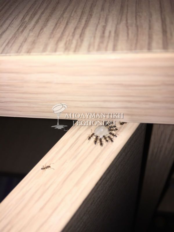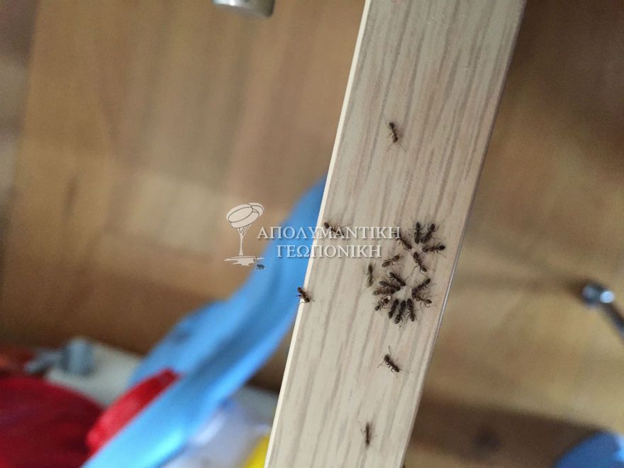 Καταπολέμηση μυρμηγκιών σε ντουλάπια και πάγκο κουζίνας σε διαμέρισμα στη Γλυφάδα Αττικής. Η πιο ριζική καταπολέμηση των μυρμηγκιών σε εσωτερικούς χώρους γίνεται με τη χρήση εντομοκτόνων σε μορφή δολώματος (γέλης) με τροφοελκυστικά. Τα έντομα συνεχίζουν κανονικά τις συνήθειες τους και μεταφέρουν μέρος του σκευάσματος στη φωλιά. Στη συνέχεια μοιράζεται στον πληθυσμό με αποτέλεσμα να έχετε απαλλαγεί εντός λίγων ημερών.