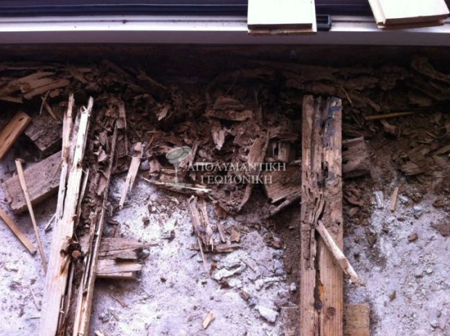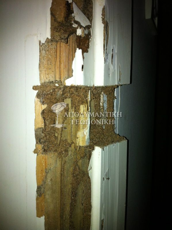 Στο καινούργιο κούφωμα εσωτερικής πόρτας φαίνεται ξεκάθαρα το χαρακτηριστικό χωμάτινο κανάλι που κατασκευάζουν οι τερμίτες πλησιάζοντας το ξύλο. Στο πάτωμα του σαλονιού σε κάποια σημεία απουσιάζουν ολόκληρα κομμάτια από τα δοκάρια του πατώματος. Οι τερμίτες στο σπίτι εισέρχονται διαμέσου χωμάτινων αγωγών και διαπερνώντας με ευκολία όλα τα οικοδομικά υλικά από ρωγμές τους, έχουν πρόσβαση σε όλα τα ξύλινα μέρη και μη. Οι υπόγειοι τερμίτες συγκριτικά με τους τερμίτες ξύλου (υγρού ή ξηρού) είναι αδηφάγοι και σύντομα η κοινωνία τους αριθμεί χιλιάδες έντομα που ζουν συνεργατικά με σκοπό τη διαιώνιση της.
