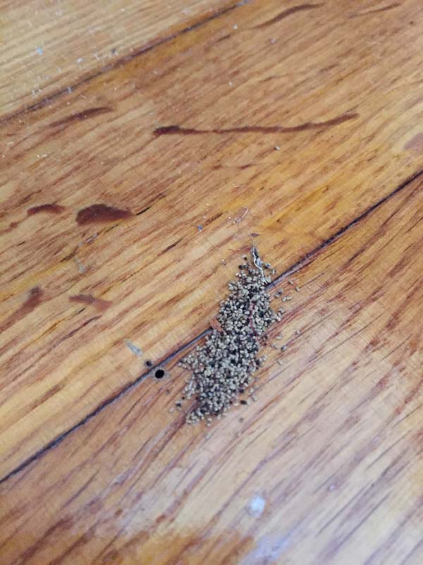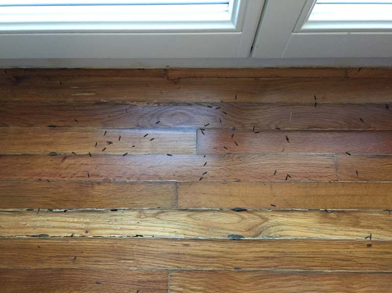 Η κύρια ζημιά από τερμίτες ξηρού ξύλου παρουσιάστηκε αρχικά στο ξύλινο πάτωμα μίας κρεβατοκάμαρας, η οποία έγινε αντιληπτή εξαιτίας των πτερωτών (σμηνουργών) του τερμίτη που για δέκα περίπου ημέρες συνέχιζαν να διέρχονται από το ξύλο κοντά στην μπαλκονόπορτα. Πιο συγκεκριμένα διέρχονταν από κάποιες ασυνέχειες του πατώματος και από κάποιες μικρές οπές , στη συνέχεια βρίσκονταν νεκρά, παρατηρούνταν αποσπασμένες πτέρυγες των εντόμων και μικροί σωροί που θύμιζαν σπόρους ή κόκκους πιπεριού.